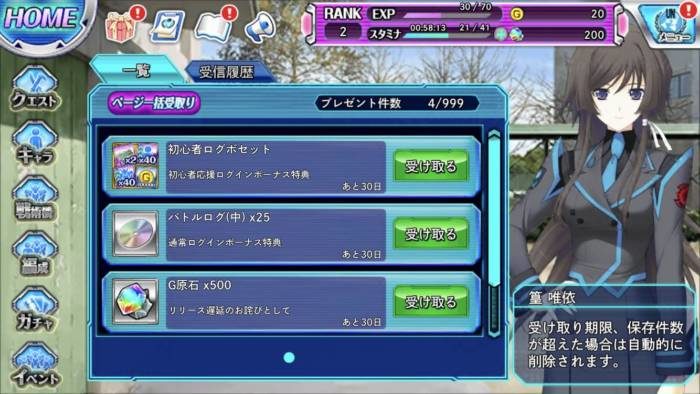 チュートリアルをスキップして、自由に動けるようになったらホーム画面左上のプレゼントアイコンから初心者ログインボーナスやチュートリアル突破報酬のG原石とSSRガチャチケットを受け取ります。
