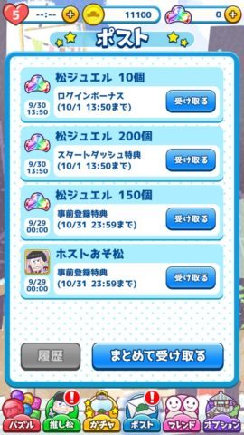 チュートリアルが終わって自由に動けるようになったらフッターメニューのポストからログインボーナスや事前登録特典の松ジュエルを回収します。