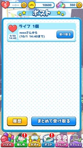 にゅ~パズ松ではフレンドにライフを送ることができるので、フレンドからライフを送ってもらえばそれだけ多くゲームをプレイできます。