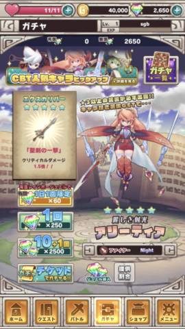 二つとも星5装備、キャラの内容は同じですが、CBT人気キャラピックアップガチャでは星5武器の「エクスカリバー」+星5ファイターの「アリーティア」が出現しやすくなっています。対して、リリース記念ガチャは同一レアリティの武器、キャラは全て均等確率になっています。