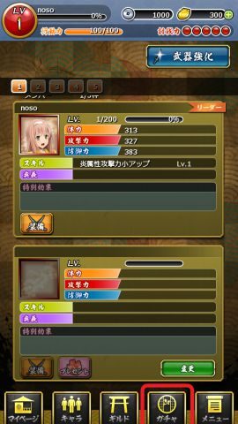 チュートリアルでデッキ編集に進みますが、無視してフッターボタンからガチャに行きます。