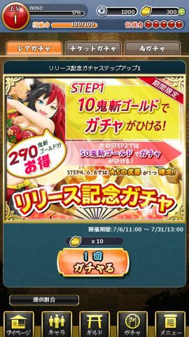 リリース記念ガチャはステップアップになっており、ひく毎に必要な鬼斬ゴールドが増えます。