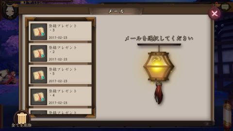 2/23時点では事前登録の報酬(登録プレゼント)で勾玉100個と神秘の霊符が2つがもらえました。