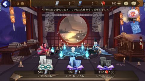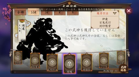 召喚から出現する式神の最高レアリティはSSRですが確率は公表されておらず、なかなか入手は難しいです。