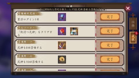 連続して100回、200回とSSR式神が出ないと任務で慰めの勾玉がもらえるのですが、その不名誉な任務も達成してしまいました。。。