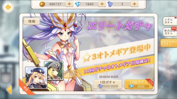 エリートガチャはガチャチケットかダイヤ450個、10連ならダイヤ4050個でオトメギアが1体以上確定します。