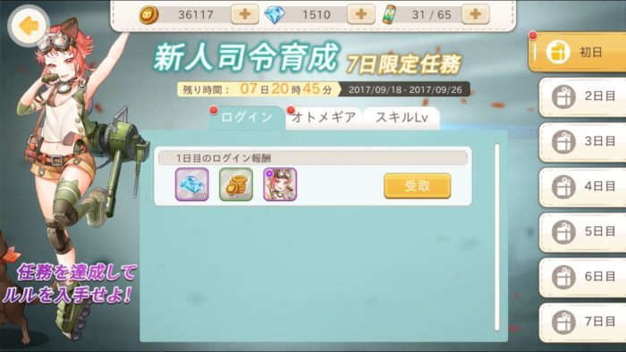 次に画面上部の新人応援のログインとオトメギアのタブからダイヤを回収します。
