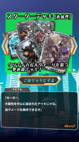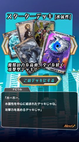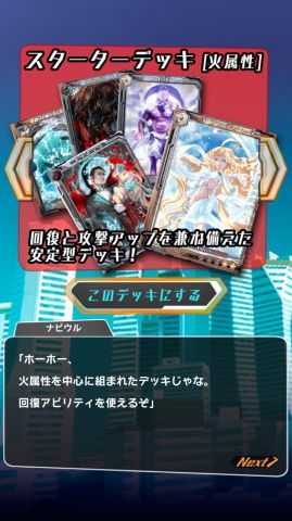 火属性、水属性、木属性の3種類からスターターデッキを選択します。