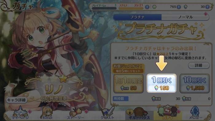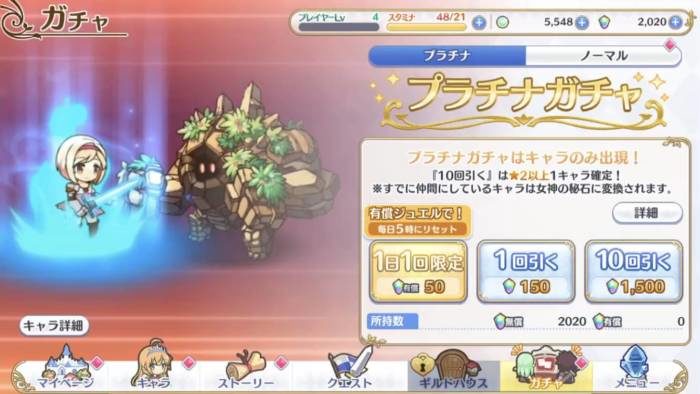 リセマラで利用するプラチナガチャは1回当たりジュエル150個、10連ガチャはジュエル1500個で星2以上のキャラが1体確定します。