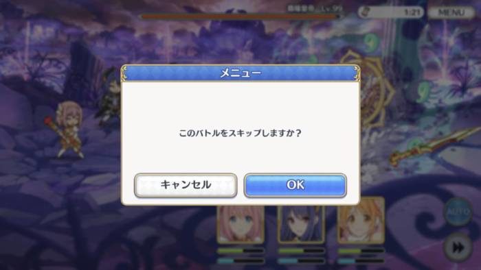オープニングで発生するバトルやシナリオ、チュートリアルバトルは画面右上の「MENU」からスキップすることができます。