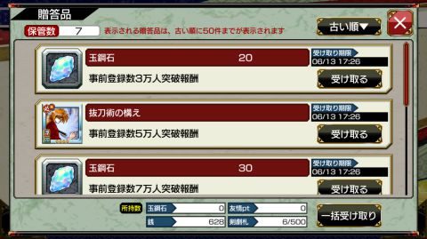 贈答品(プレゼントボックス)で「事前登録報酬」などの玉鋼石を受け取ります。