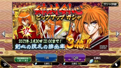 3/30(木)までは緋村剣心ピックアップガシャが開催されています。