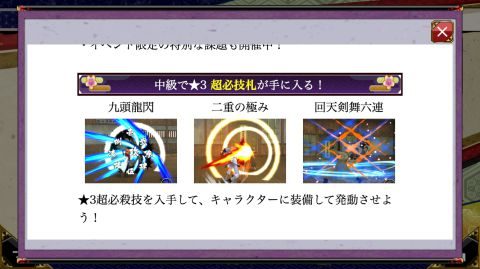 開催中のイベント「偽抜刀斎討伐」の中級では、星3の状態で上記の必殺技を手に入れることが出来ます。