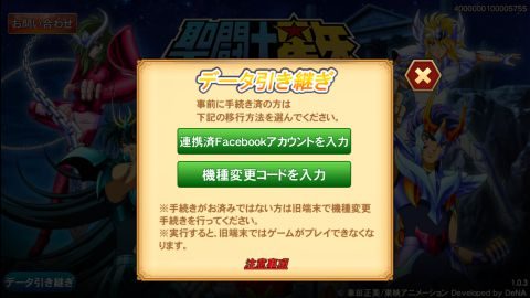 もう1台の端末のタイトル画面で「データ引き継ぎ」から機種変更コードを入力します。