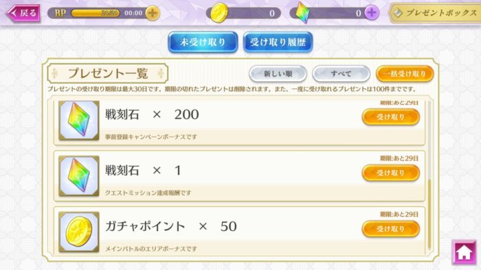 プレゼント一覧から事前登録キャンペーンなどの「戦刻石」を回収します。