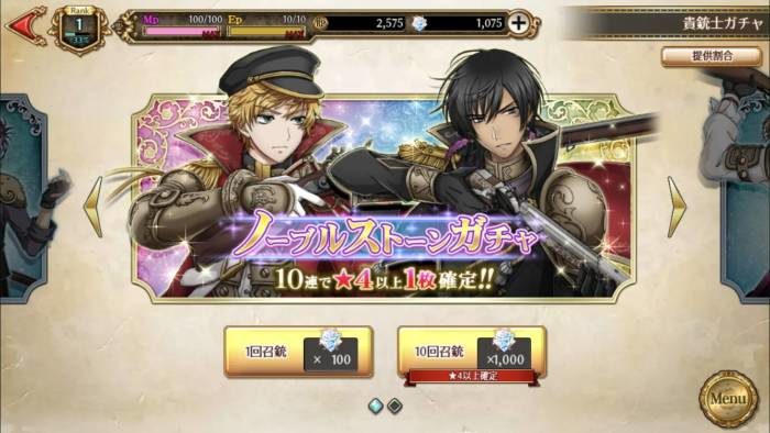 ノーブルストーンガチャは1回当たりノーブルストーン100個、10連ガチャは1000個で星4カードが1枚確定します。3/22時点では事前登録報酬もあって、10連ガチャを引くことができました。