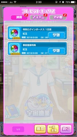 自由に動けるようになったらプレゼントボックスからログインボーナスや事前登録報酬の虹玉を回収します。