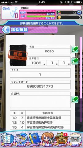 名前と生年月日はホーム画面のメニュー⇒部長情報から変更することができます。
