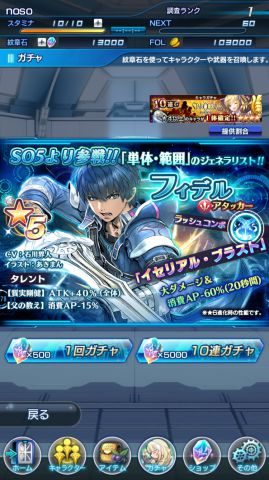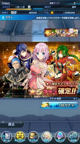 所持している紋章石でまずはキャラガチャの10連を引きます。