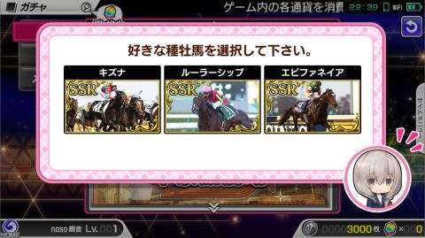 チュートリアルガチャでは3頭のSSR牡馬から好きなSSR株券を選ぶことができます。