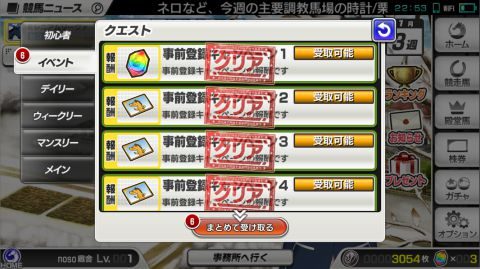「クエスト」の「イベント」から事前登録報酬を受け取ります。