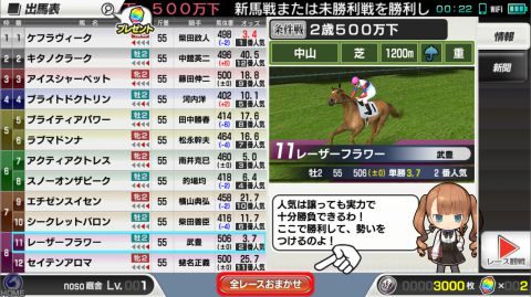 ガチャから手に入れた株券でナビに従って新馬の生産を行います。
