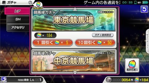 レアガチャは「東京競馬場」、「中京競馬場」、「京都競馬場」の3種類があり、それぞれで出現する株券が違います。
