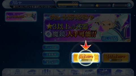 ガシャはダイヤ(無料石)なら20個、鏡晶石(有料石)なら200個で1回引けます。