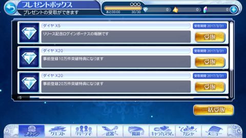 ブリッジの左のプレゼントボックスに「リリース記念ログインボーナス」や「事前登録特典」のダイヤが届いているので受け取ります。