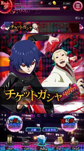 ガシャの演出は虹がSSR、金がSR、銀がRに、血のりが付けば喰種、血のりがつかなければ喰種捜査官に対応しています。
