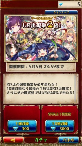 「強くてニューゲーム」のリセマラではガチャからURキャラ(図書精霊)を狙いますが、事前登録特典なしにガチャを回すのが難しいです。