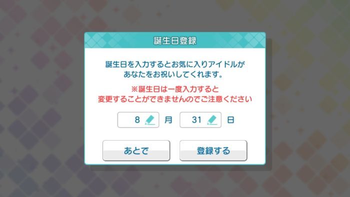 誕生日の設定で今日を設定すると、チュートリアル終了後にプリズム50個がもらえます。