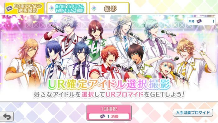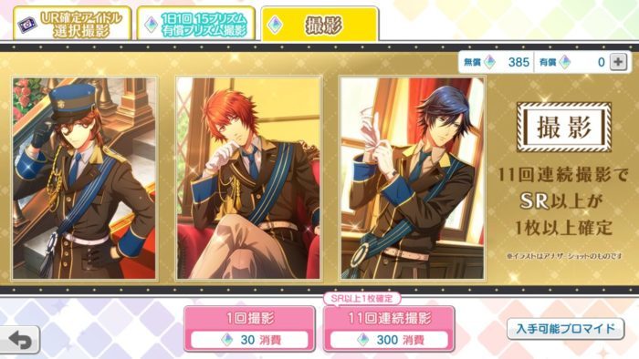 ガチャ1回プリズム30個、11連ガチャはプリズム300個でSR以上のプロマイドが1枚確定します。