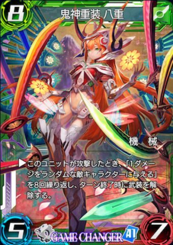 | このユニットが攻撃したとき、「1ダメージをランダムな敵キャラクターに与える」を8回繰り返し、ターン終了時に武装を解除する。 | ||