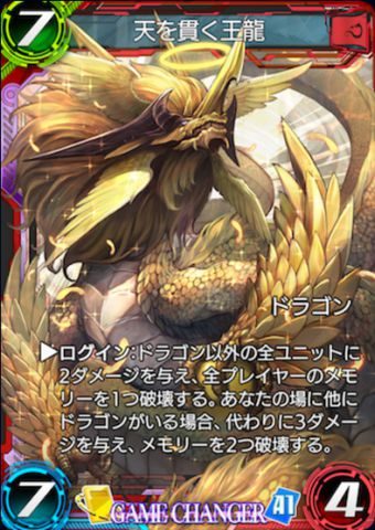 | ログイン:ドラゴン以外の全ユニットに2ダメージを与え、全プレイヤーのメモリーを1つ破壊する。あなたの場に他にドラゴンがいる場合、代わりに3ダメージを与え、メモリーを2つ破壊する。 | ||