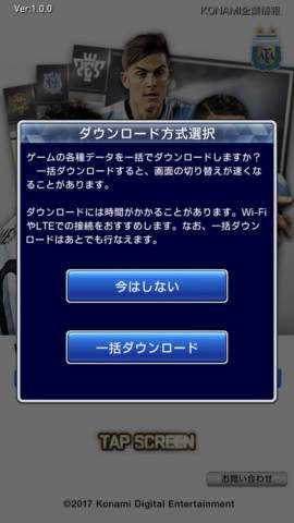 ゲームを始めると、まず一括ダウンロードの選択がありますが、リセマラ中は効率化のため後回しにして、「今はしない」を選びましょう。