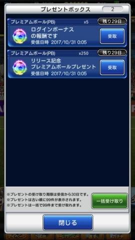 チュートリアルが終わり自由に動けるようになったら、マイページのプレゼントボックスから、ログインボーナスやリリース記念のPBを回収します。
