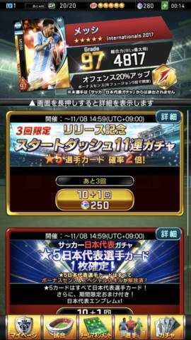 11/8までは星5選手の確率が倍になる「リリース記念スタートダッシュ11連ガチャ」が開催されているので、期間中に星5選手カードを集めて戦力を整えましょう!11連ガチャから星5選手が複数出ることも珍しくありません。