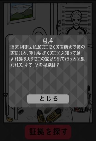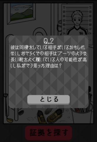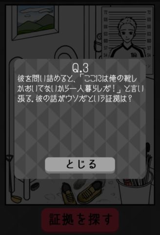 画面左の靴棚の一番上にあるピンクの靴をタップし、「証拠を探す」を押そう。