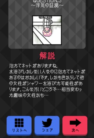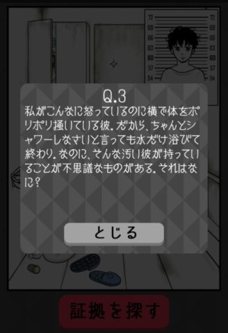浴槽の蛇口にかかっているピンクのスポンジをタップし、「証拠を探す」を押そう。
