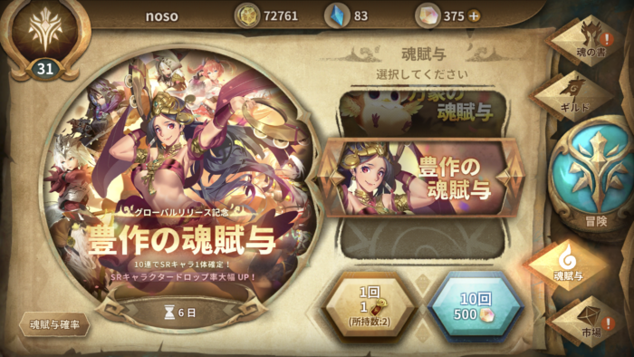 『豊作の魂賦与』は観察者レベルが25になると引けるようになる期間限定の魂賦与で、全てSRキャラクターが通常の2倍以上の出現率になっているお得なガチャです。