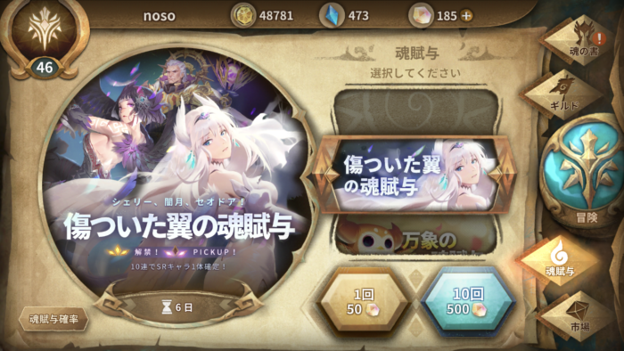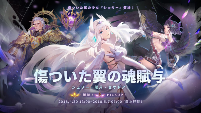 『傷ついた翼の魂賦与』は観察者レベルが25になると引けるようになる期間限定の魂賦与で、新キャラクターのシェリーをはじめ、闇月、セオドアがSSRで出現するピックアップガチャです。