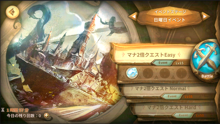 オープンβの時にマナ2倍クエストは土曜日と日曜日に開催されており、Easyで1500のマナを獲得できました。