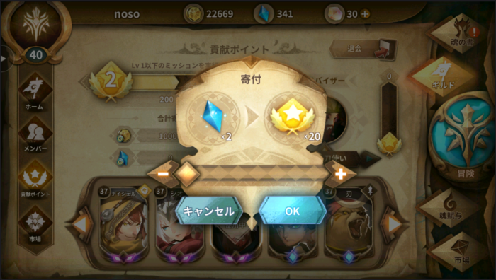 ギルドではカケラを寄付することでギルドのレベルや貢献レベルを上げるための貢献ポイントを1個あたり10ポイント獲得できます。