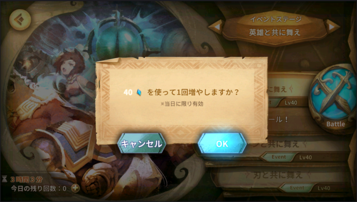 英雄と共に舞えには1日1回の回数制限がありますが、カケラを消費することで回数制限を追加できます。