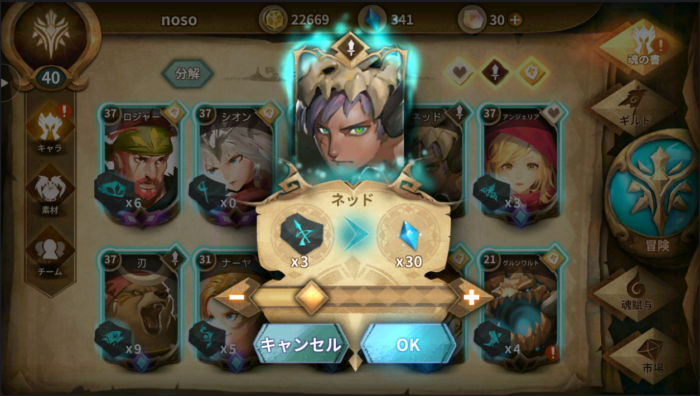 魂賦与(ガチャ)やクエストで手に入ったキャラクターの結晶は魂の書で1個あたりカケラ10個に分解できます。