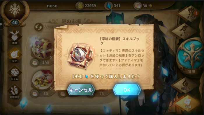 市場ではSSRキャラを更に共鳴するために必要なスキルブックや共鳴の素材、万象のしおり(ガチャチケット)など有用なアイテムがカケラで購入可能です。