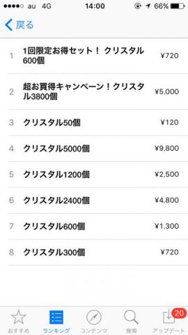 AppStoreのアプリの詳細画面から「App内課金有り」を選択すると、そのタイトルで販売される商品が販売数の多い順に並びます。(集計期間が永続なのか一定期間なのかは不明です。)