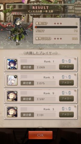 参考までに2000程度の総合値で調整し、モノガタリ1章の1回の戦闘で500以上の熟練度を獲得できました。