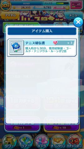 この「テニス秘伝書」を使うと購入時から30分、獲得経験値・ゴールド・テニソウル・ルーンが2倍になります。